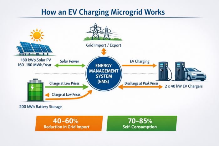 This insight summarises the operational, financial and strategic benefits of a typical microgrid system, comprising 180 kWp of solar photovoltaic (PV) generation, 200 kWh of battery storage and 2 x 40 kW DC EV chargers (80 kW total capacity), operating within a dynamic pricing model.